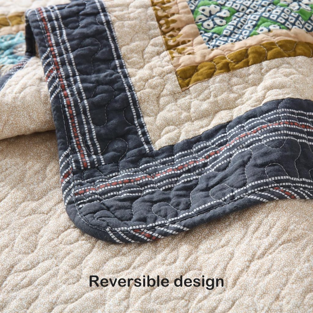 Reversible Design: One of the standout features of this quilt is its reversible design. Each side showcases a distinct pattern and color scheme, allowing you to change the look of your bedroom with a flip of the quilt. It’s like having two quilts in one.